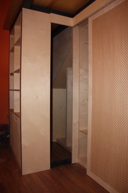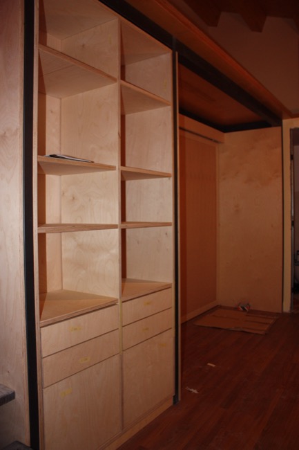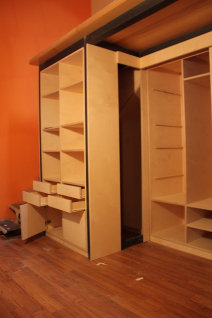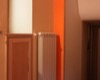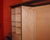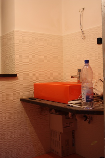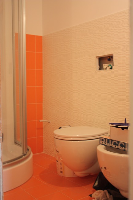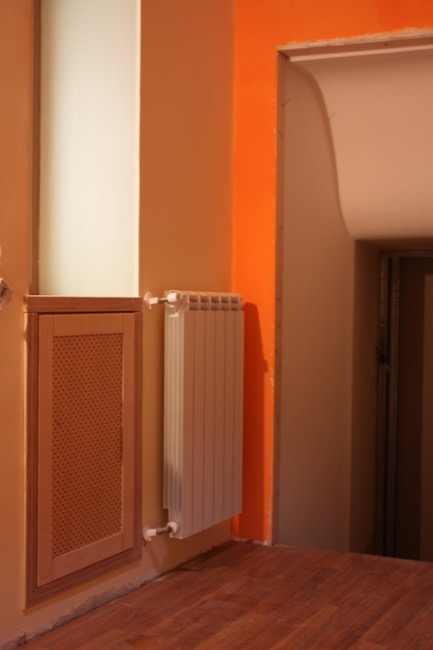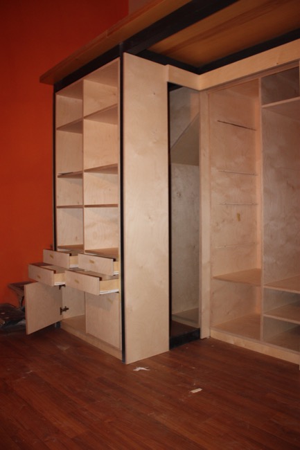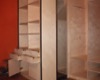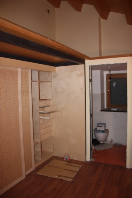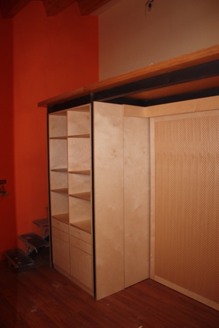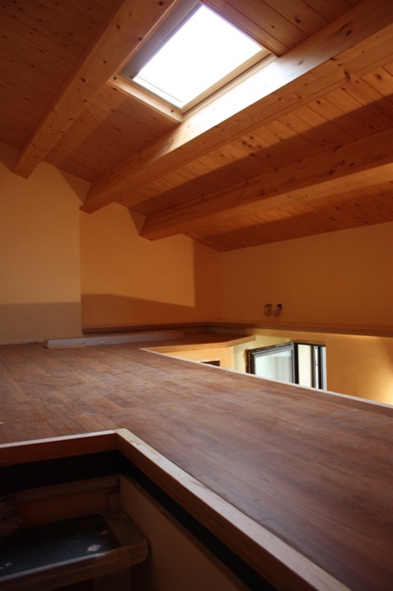 Nel settembre 2008, dei clienti mi chiesero di progettare un soppalco attrezzato da realizzare all’interno di un volume abitativo annesso alla loro casa da adibire a camera da letto. Considerate le modeste dimensioni e le esigenze della committenza, pensai ad una struttura autoportante con la parte inferiore destinata ad armadio e cassettiera, e la parte superiore destinata al riposo. La struttura del soppalco è stata realizzata con profilati di ferro, l’armadio invece è stato realizzato in multistrato di Betulla. All’interno del volume ho curato anche la realizzazione del bagno ed in accordo con i clienti, ho scelto delle finiture colorate con l’arancio, utilizzato anche per il lavabo montato su una lastra in pietra pece.