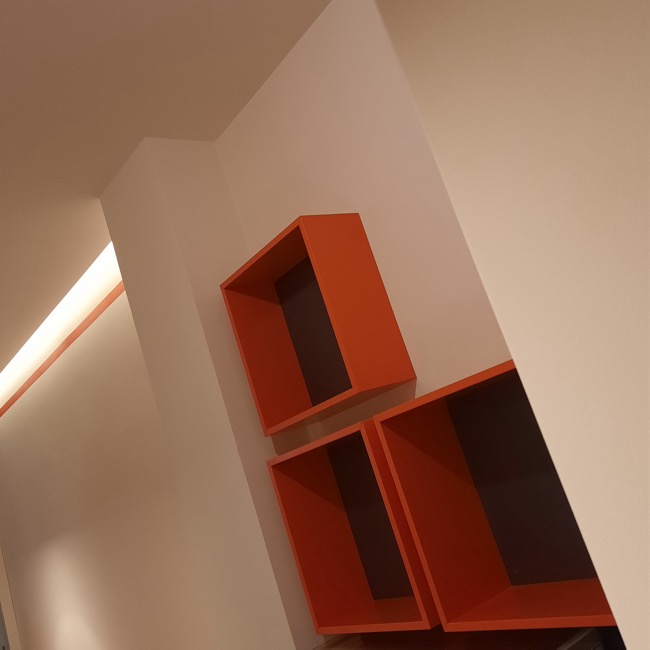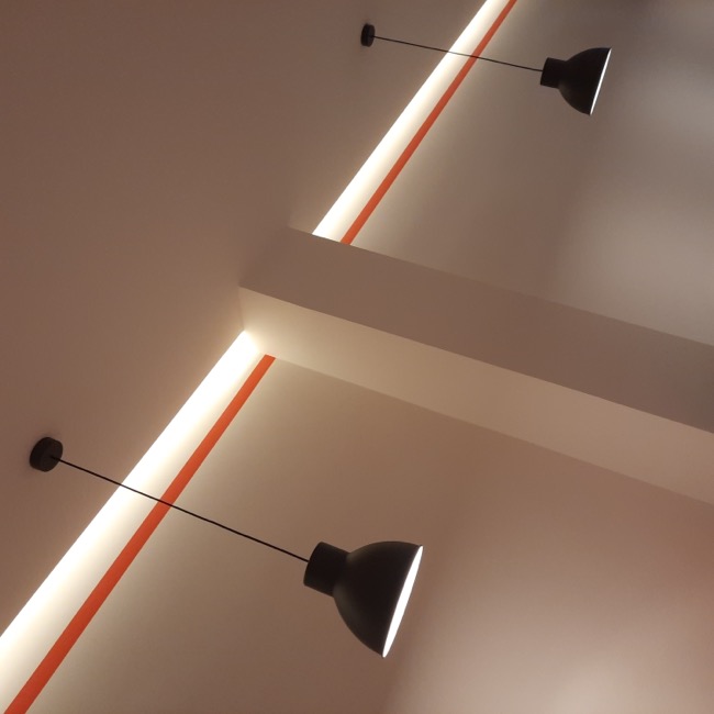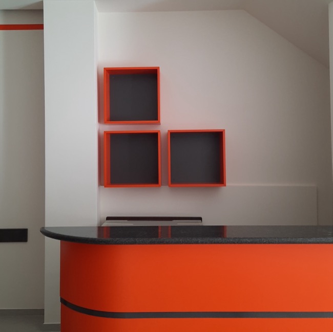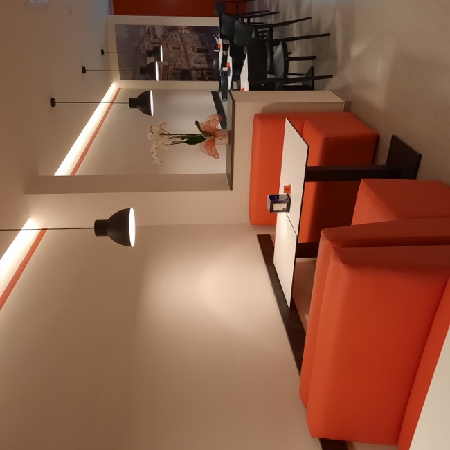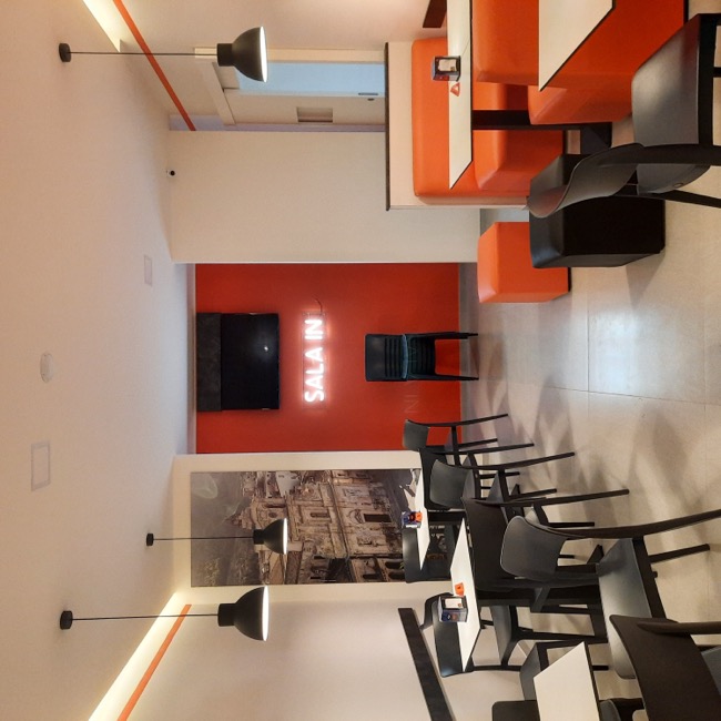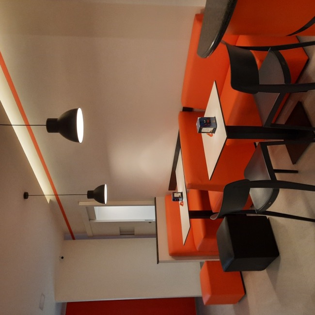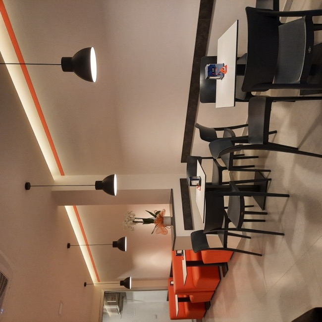 Nel settembre 2023 dei clienti mi chiesero dei consigli su come arredare un piccolo locale da adibire a sala da the, da utilizzare a servizio del bar di loro proprietà. Originariamente destinato ad altri usi e di forma quadrangolare, il locale si prestava ad una distribuzione interna molto simmetrica dove, in corrispondenza dell’ingresso, ho predisposto un banco attrezzato per la sala e ai lati ho sistemato i tavoli e i divanetti per la clientela. In fondo al locale ho ritenuto di schermare due porte di servizio in modo da evitare interferenze visive con i clienti del locale e rendere più accogliente l’ambiente. La scelta della tinteggiatura di colore arancio è stata ricavata dal logo del Bar. A questa sono stati abbinati il colore bianco di fondo alle pareti e un grigio antracite negli altri complementi di arredo, il tutto per mitigare la cromia forte dell’arancio predominante. I corpi illuminanti sono stati istallati in corrispondenza di ogni tavolo in maniera ordinata, quale scansione visiva all’interno dell’ambiente. Per dare memoria storica ed ambientale ad un locale nato nel centro storico della cittadina, ho inserito due foto a grande formato alle pareti più esposte, creando nel complesso un ambiente più caldo e accogliente