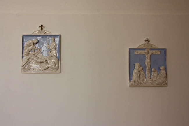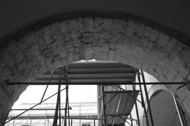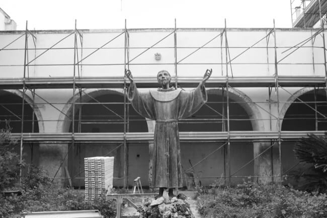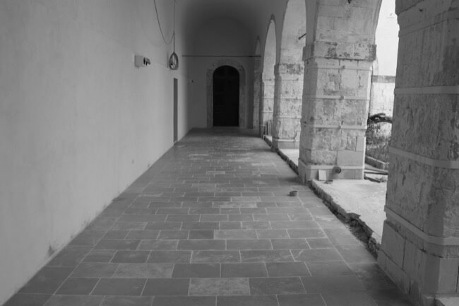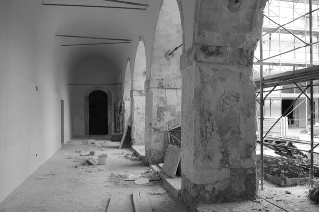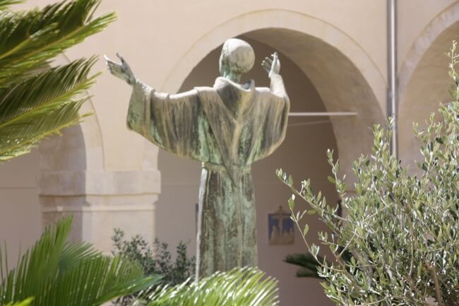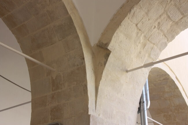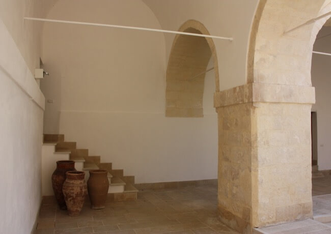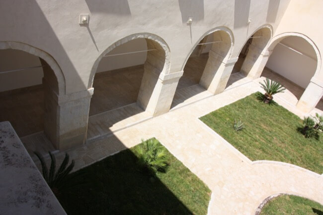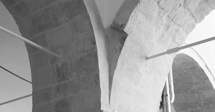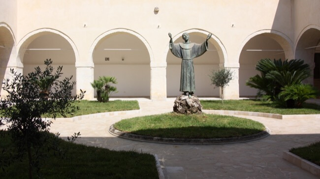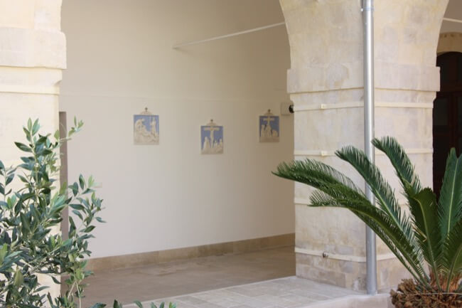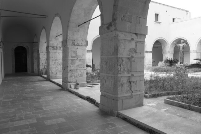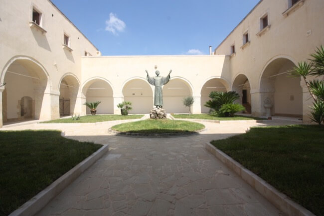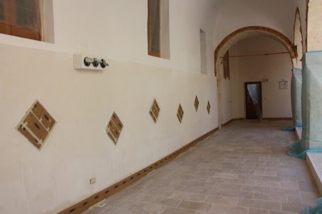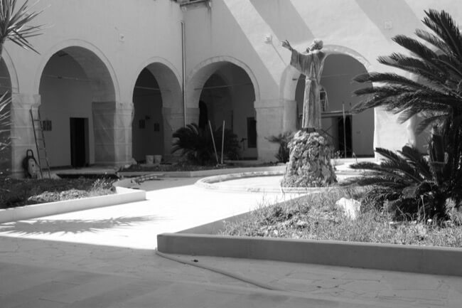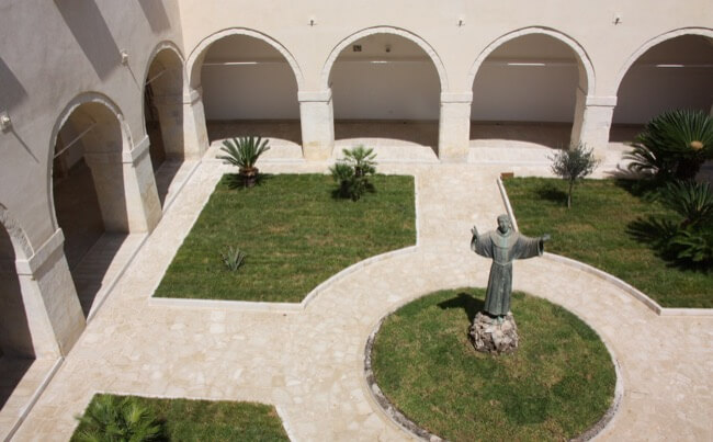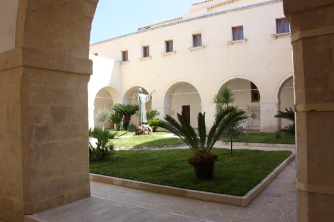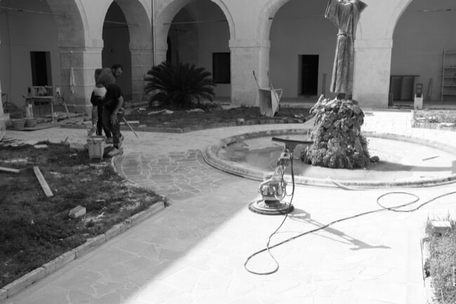 Il convento della Chiesa di S. Maria di Gesù, fu fondato fra il 1515 ed il 1522 da Donna Isabella Caruso Statela e affidato ai Frati del Terzo Ordine Regolare di S. Francesco. Nel 1562 con Bolla di Papa Pio V passava ai Frati minori, denominati “Frati dell’Osservanza”. La struttura ha conservato le caratteristiche tipiche dell’architettura Francescana, chiostro, portico e con annessa la chiesa. Il terremoto del 1693 non provocò particolari danni all’edificio che fu prontamente restaurato ed ultimato probabilmente nel 1756. Il Convento si affaccia con il suo prospetto principale dal costone roccioso prospiciente alla vallata ispicese sottostante, mentre il prospetto laterale della Chiesa delimita la piazza omonima. Gli altri due lati del complesso, invece, sono rivolti verso la città. Nella primavera del 2015, il Frate guardiano del Convento, durante i lavori di recupero e conservazione dell’immobile realizzati ai sensi della L. 433 del 31 dicembre 1991, con la volontà di completare quei lavori non previsti dal citato intervento, su suggerimento del Soprintendente pro tempore, mi dette incarico di redigere un nuovo progetto di restauro, avendo cura di realizzare anche la pavimentazione del chiostro e del giardino di San Francesco. I lavori hanno previsto la pulitura degli elementi lapidei nei pilastri e all’intradosso delle arcate. Durante i sopralluoghi di verifica evidenziati attraverso gli elaborati grafici e fotografici, si evidenziavano diverse patologie legate a cause di diversa natura. La rimozione degli intonaci eseguita durante i lavori svolti nel precedente intervento di miglioramento strutturale, aveva lasciato, infatti, segni evidenti dovuti ad un uso improprio del mezzo meccanico. Anche l’intervento di “cuci e scuci”, peraltro localizzato in alcuni pilastri più sollecitati, ha reso necessario un ulteriore intervento di pulitura e stuccatura degli elementi lapidei con l’intento di uniformare, per quanto possibile, l’aspetto materico diverso, pur mantenendo leggibile il nuovo intervento sul preesistente. Si è provveduto, pertanto, alla pulitura con micro sabbiatura, a pressione inferiore a 2 Atm, operata con granuli ecologici vegetali - tutoli di mais, efficaci sulle superfici da trattare e tali da non deteriorare gli elementi lapidei stessi. Compatibilmente ai limiti di spesa, l’intervento è consistito nella rimozione di tutte quelle finiture posticce realizzate nel corso degli anni, nonché il rifacimento della pavimentazione del chiostro, all’epoca realizzata con marmette di cemento. Al posto di quest’ultime, infatti, in accordo con la Soprintendenza BB.CC.AA, sono state posate delle basole di calcare duro locale di larghezza adeguata, disposte a ricorsi regolari. Nei viali del giardino, invece, la stessa pietra è stata posata a scaglie irregolari e rotte, per dare un effetto più naturalistico d’insieme. Con l’aiuto dei fedeli, infine, siamo riusciti a completare l’intervento, attraverso una rivisitazione delle aiuole, con un ridisegno semplificato delle orlature e la piantumazione di essenze arboree e arbustive, intorno alla statua bronzea di San Francesco.