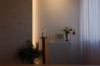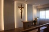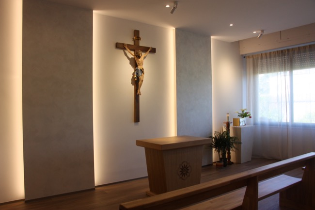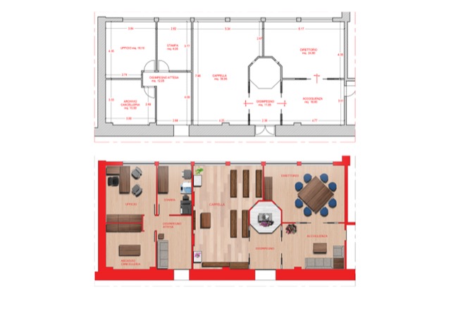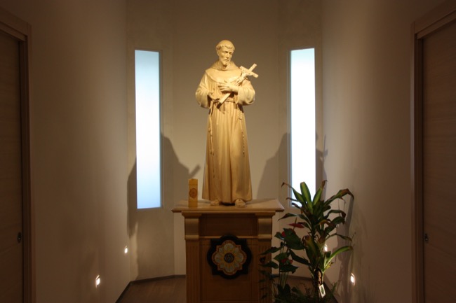 Nell’ottobre 2023 i Frati minori del Convento di San Biagio, mi chiesero di allestire alcune sale della struttura da destinare a locali di rappresentanza e di preghiera. La necessità dei frati era quella di avere una stanza per le riunioni del Direttorio, una cappella liturgica e delle altre sale di servizio adibite ad uffici ed archivio. Durante i rilievi mi trovai di fronte due grandi sale pavimentate a scacchiera, illuminate da grandi finestre scorrevoli. Se da un lato le sale permettevano un’ampia flessibilità progettuale, dall’altro, i vincoli di porte e finestre diventavano elementi forti da rispettare. Nella fase di studio progettuale, ho suddiviso la prima sala staccando un piccolo spazio di forma ottagonale quale disimpegno di accesso al Direttorio e alla realizzanda cappella liturgica. Nel disimpegno ottagonale è stato collocato il simulacro di San Francesco, le sale direzionali sono state arredate in modo semplice e funzionale rispettando la dottrina francescana. Quanto alla cappella liturgica, per mantenere uno stile sobrio e semplice, ho ritenuto di creare soltanto delle scansioni verticali a tutt’altezza nella parete di fondo, quali nicchie nelle quali collocare il Crocifisso, la Madonna ed il Santissimo. Il progetto illuminotecnico ha permesso un gioco di luci molto semplice e pulito su delle superfici chiare, evidenziate soltanto da un leggero movimento di volumi La seconda sala è stata suddivisa creando un ufficio, un archivio e uno spazio operativo destinato alle attrezzature, il tutto tenendo conto degli arredi esistenti in relazione alle grandi aperture scorrevoli. Le tramezzature sono state realizzate con pannelli in cartongesso, isolate da lana di roccia per garantire una fono assorbenza adeguata, montate su una struttura di profili zincati ancorati al pavimento ed al soffitto. Per coprire l’esistente pavimentazione a scacchiera, sia nel disimpegno, sia nella cappella, è stato posato un nuovo pavimento in sovrapposizione utilizzando una tipologia di Parquet tipo Clap, che ha permesso di uniformare le nuove superfici calpestabili creando un ambiente più accogliente. Gli infissi in alluminio sono stati schermati da tendaggi chiari e le controsoffittature nei vari ambienti hanno contribuito al gioco dei volumi e delle luci senza particolari forzature, creando degli spazi di preghiera e di accoglienza tutta francescana.